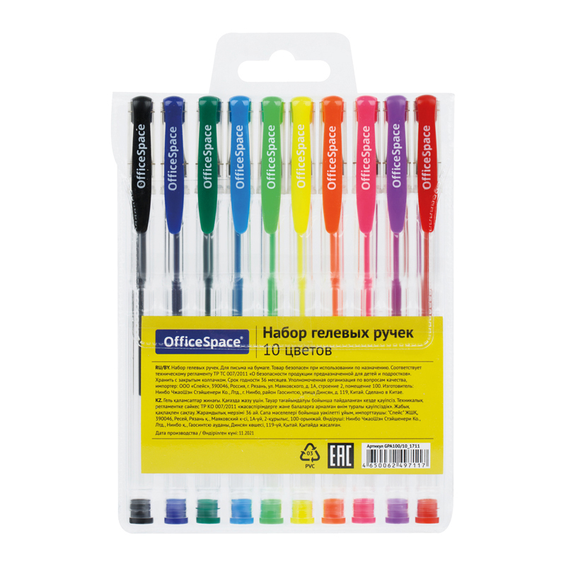 Набор гелевых ручек OfficeSpace – это удобство в использовании и отличное качество. Внутри ручки в прозрачном пластиковом корпусе – гелевые чернила, которые ярко пишут на бумаге. На каждой модели есть колпачок с клипом – можно закрепить её на одежде или тетради. Диаметр пишущего узла 1,0 мм, благодаря чему ручка оставляет широкую линию и мягко пишет без нажима. Цвета чернил: черный, синий, голубой, розовый, зеленый, светло-зеленый, красный, желтый, оранжевый, фиолетовый. В наборе 10 ручек, упаковка – чехол из ПВХ с ероподвесом.